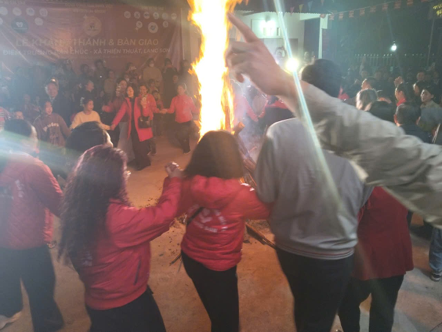 (Bên ngọn lửa trại ấm áp, tất cả cùng nắm tay để nối dài những vòng tay nhân ái).